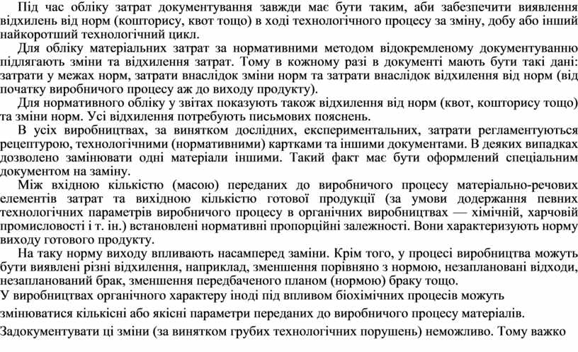 Під час обліку затрат документування завжди має бути таким, аби забезпечити виявлення відхилень від норм (кошторису, квот тощо) в ході технологічного процесу за зміну, добу або інший найкоротший технологічний цикл.