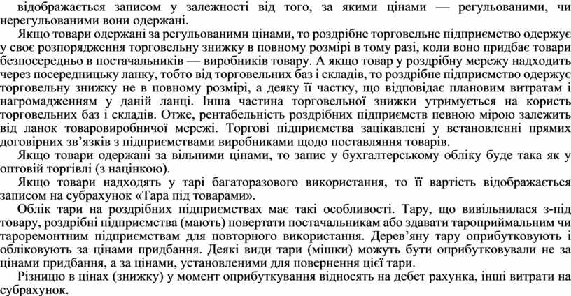 Облік тари на роздрібних підприємствах має такі особливості. Тару, що вивільнилася з-під товару, роздрібні підприємства (мають) повертати постачальникам або здавати тароприймальним чи тароремонтним підприємствам для повторного використання. Дерев’яну тару оприбутковують і обліковують за цінами придбання. Деякі види тари (мішки) можуть бути оприбутковували не за цінами придбання, а за цінами, установленими для повернення цієї тари.