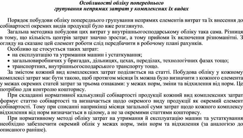 Порядок побудови обліку попереднього групування непрямих елементів витрат та їх внесення до собівартості окремих видів продукції було вже розглянуто.