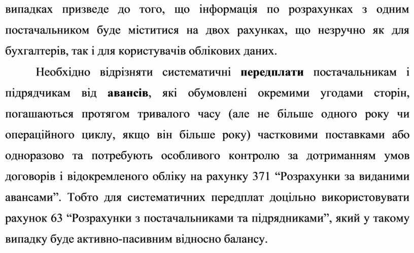 Необхідно відрізняти систематичні передплати постачальникам і підрядчикам від авансів, які обумовлені окремими угодами сторін, погашаються протягом тривалого часу (але не більше одного року чи операційного циклу, якщо він більше року) частковими поставками або одноразово та потребують особливого контролю за дотриманням умов договорів і відокремленого обліку на рахунку 371 “Розрахунки за виданими авансами”. Тобто для систематичних передплат доцільно використовувати рахунок 63 “Розрахунки з постачальниками та підрядниками”, який у такому випадку буде активно-пасивним відносно балансу.