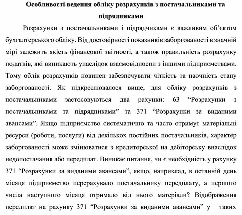 Розрахунки з постачальниками і підрядчиками є важливим об’єктом бухгалтерського обліку. Від достовірності показників заборгованості в значній мірі залежить якість фінансової звітності, а також правильність розрахунку податків, які виникають унаслідок взаємовідносин з іншими підприємствами. Тому облік розрахунків повинен забезпечувати чіткість та наочність стану заборгованості. Як підкреслювалося вище, для обліку розрахунків з постачальниками застосовуються два рахунки: 63 “Розрахунки з постачальниками та підрядниками” та 371 “Розрахунки за виданими авансами”. Якщо підприємство систематично та часто отримує матеріальні ресурси (роботи, послуги) від декількох постійних постачальників, характер заборгованості може змінюватися з кредиторської на дебіторську внаслідок недопостачання або передплат. Виникає питання, чи є необхідність у рахунку 371 “Розрахунки за виданими авансами”, якщо, наприклад, в останній день місяця підприємство перерахувало постачальнику передплату, а першого числа наступного місяця отримало від нього матеріали? Відображення передплат на рахунку 371 “Розрахунки за виданими авансами” у таких
