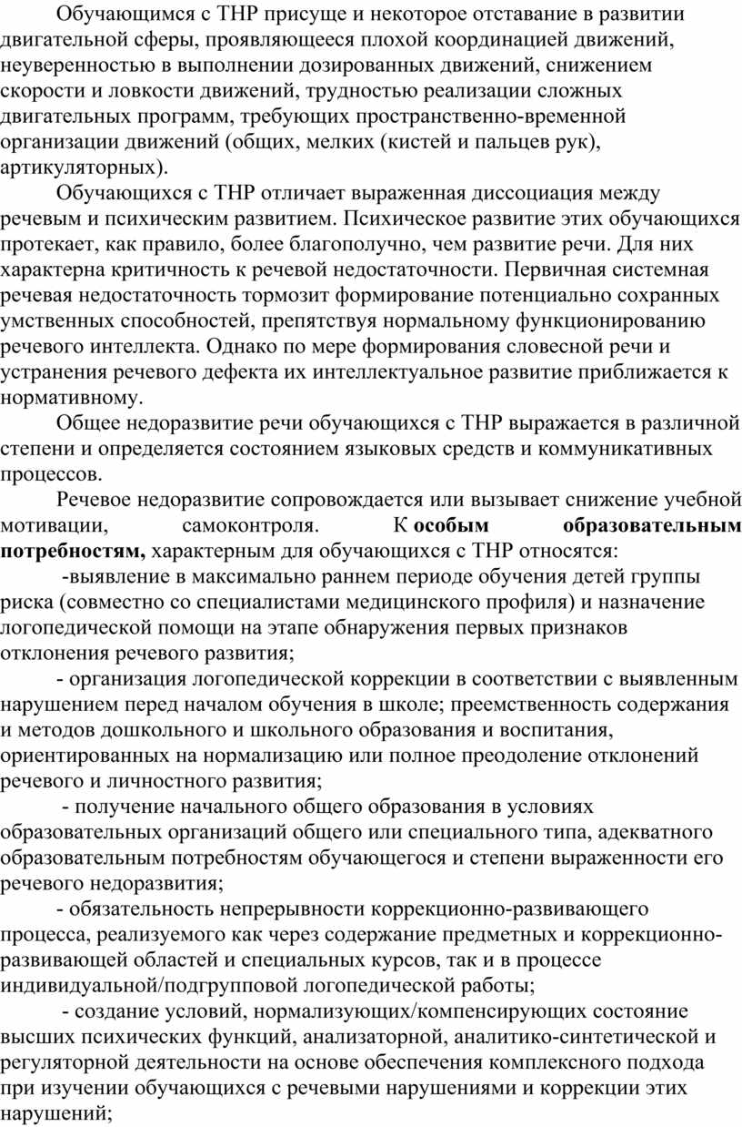 Речевое недоразвитие сопровождается или вызывает снижение учебной мотивации, самоконтроля. К особым образовательным потребностям, характерным для обучающихся с ТНР относятся: