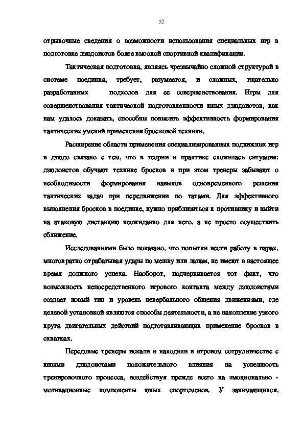 В практической деятельности тренера устойчива традиция осуществления технико-тактической подготовки юных дзюдоистов с постепенным включением их в соревновательные единоборства. В этих условиях тренеры часто упускают из виду формирование у юных дзюдоистов тактических умений выполнение бросков в условиях перемещения и изменения захвата. С помощью применения традиционных методов обучения сложно успешно решать эти проблемы при подготовки юных дзюдоистов, а применяя игровой метод это возможно осуществлять естественным путем. Игровое обучение в единоборствах получают все большее признание и возможности игрового метода еще не достаточно раскрыты в практике тренировки в дзюдо.