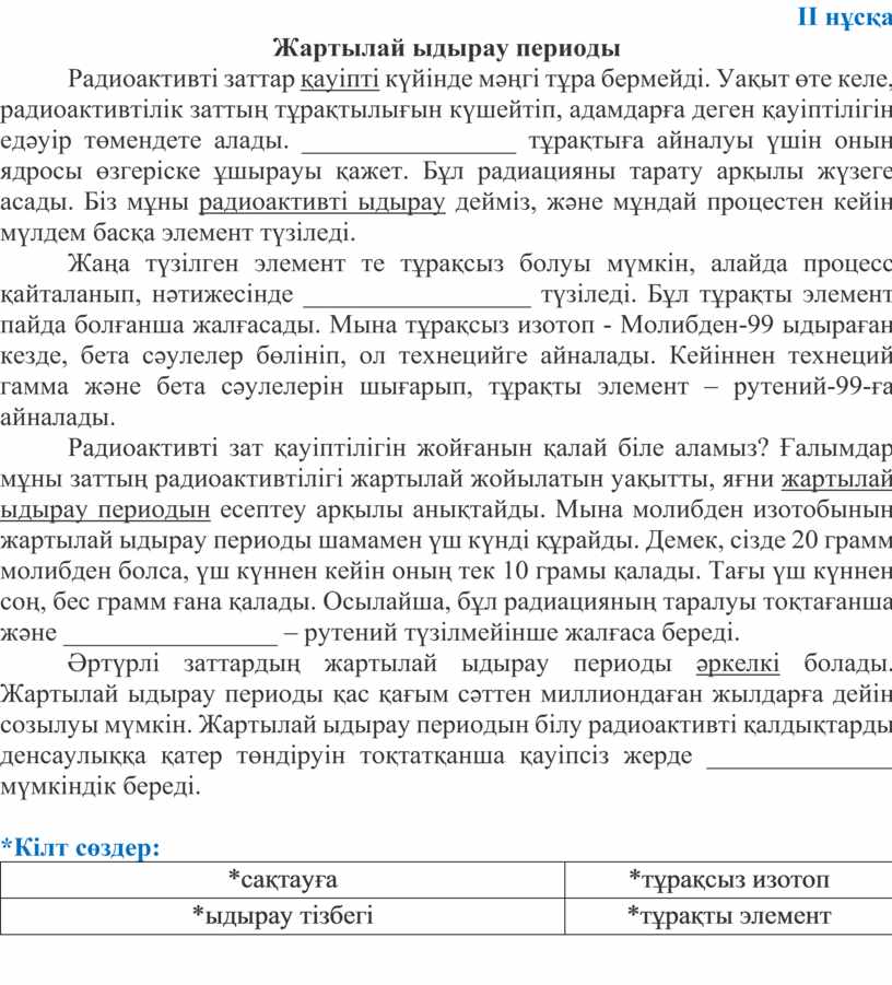 Радиоактивті заттар ____________ күйінде мәңгі тұра бермейді. Уақыт өте келе, радиоактивтілік заттың тұрақтылығын күшейтіп, адамдарға деген қауіптілігін едәуір төмендете алады. Тұрақсыз изотоп тұрақтыға айналуы үшін оның ядросы өзгеріске ұшырауы қажет. Бұл радиацияны тарату арқылы жүзеге асады. Біз мұны ___________________ дейміз, және мұндай процестен кейін мүлдем басқа элемент түзіледі.