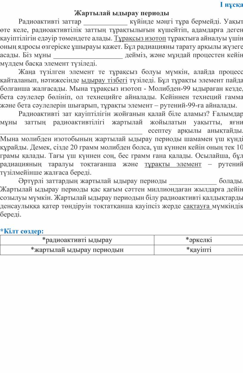 Радиоактивті зат қауіптілігін жойғанын қалай біле аламыз? Ғалымдар мұны заттың радиоактивтілігі жартылай жойылатын уақытты, яғни _______________________________________ есептеу арқылы анықтайды. Мына молибден изотобының жартылай ыдырау периоды шамамен үш күнді құрайды. Демек, сізде 20 грамм молибден болса, үш күннен кейін оның тек 10 грамы қалады. Тағы үш күннен соң, бес грамм ғана қалады. Осылайша, бұл радиацияның таралуы тоқтағанша және тұрақты элемент – рутений түзілмейінше жалғаса береді.