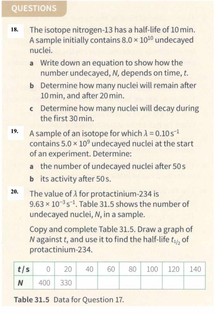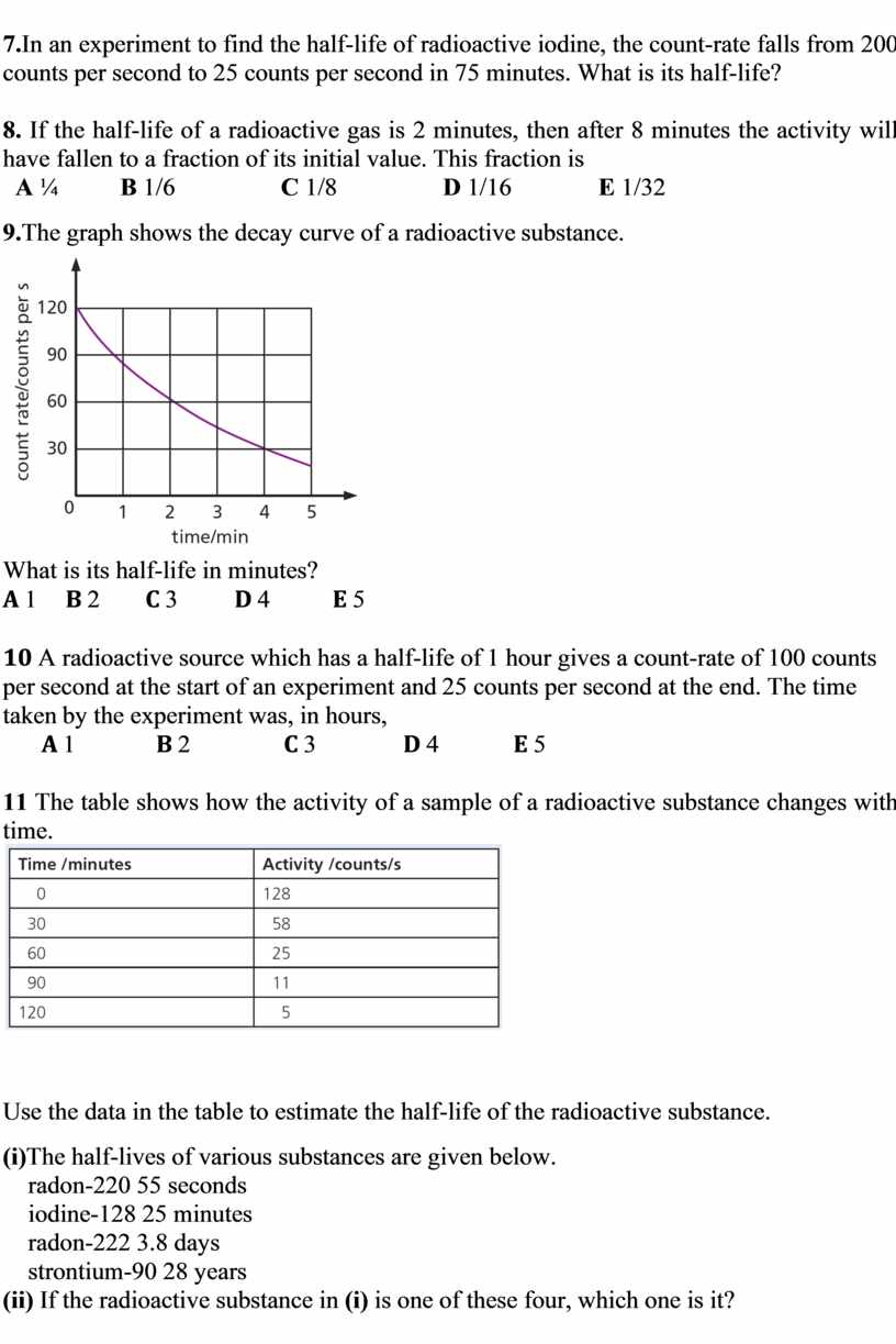7.In an experiment to find the half-life of radioactive iodine, the count-rate falls from 200 counts per second to 25 counts per second in 75 minutes. What is its half-life?
