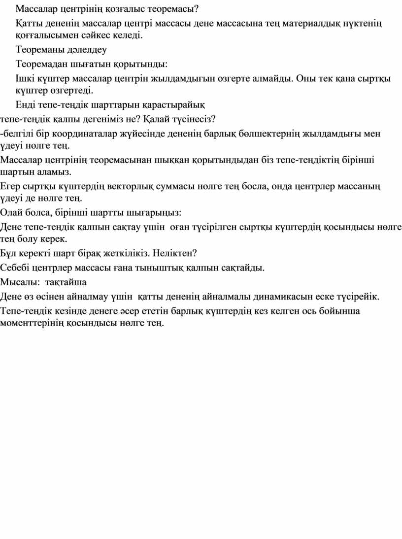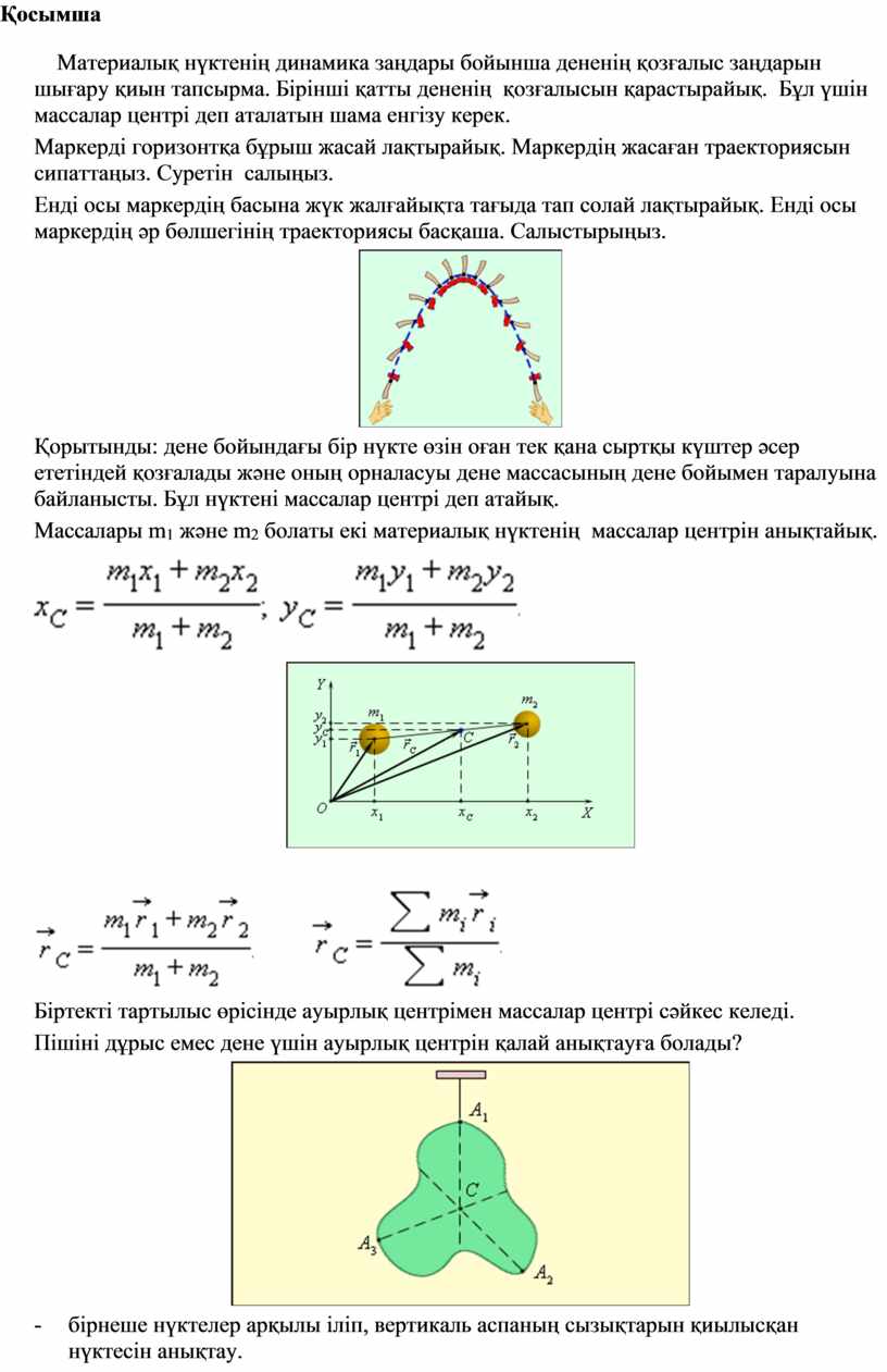 Қорытынды: дене бойындағы бір нүкте өзін оған тек қана сыртқы күштер әсер ететіндей қозғалады және оның орналасуы дене массасының дене бойымен таралуына байланысты. Бұл нүктені массалар центрі деп атайық.
