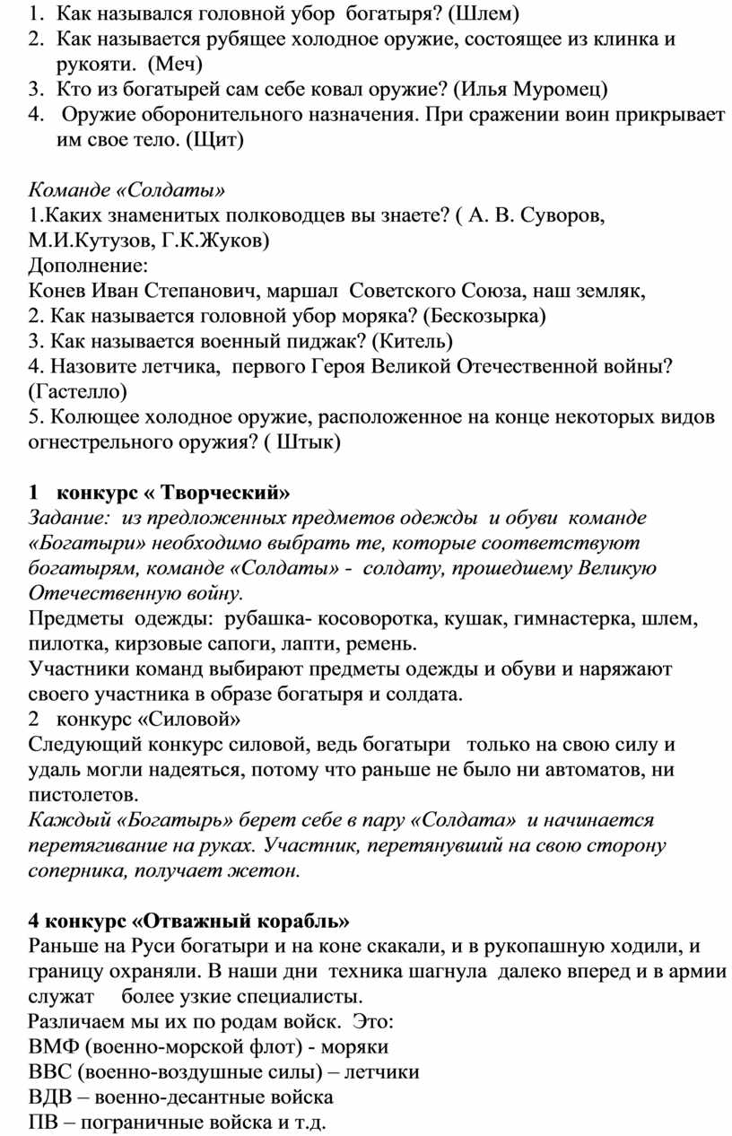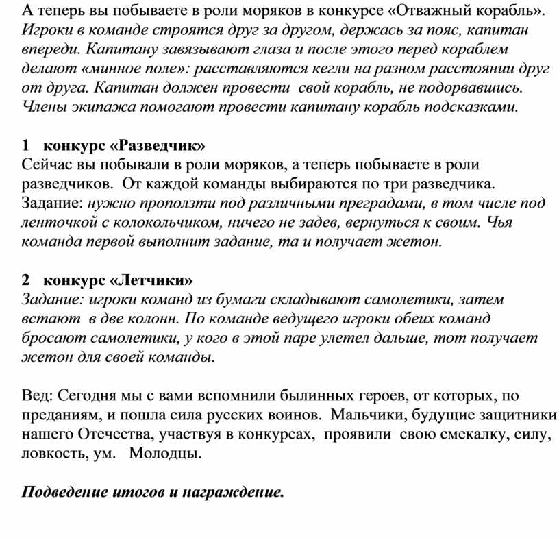 Вед: Сегодня мы с вами вспомнили былинных героев, от которых, по преданиям, и пошла сила русских воинов. Мальчики, будущие защитники нашего Отечества, участвуя в конкурсах, проявили свою смекалку, силу, ловкость, ум. Молодцы.