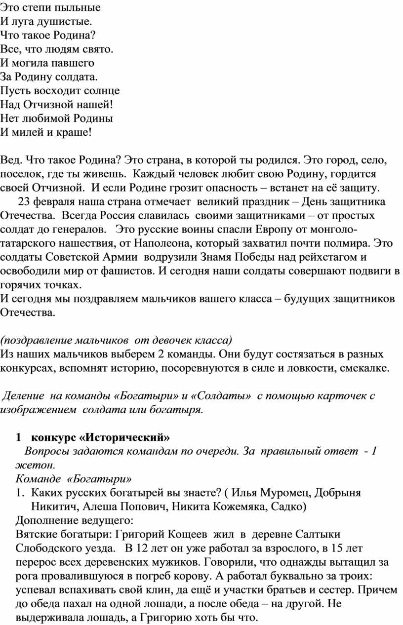 Вед. Что такое Родина? Это страна, в которой ты родился. Это город, село, поселок, где ты живешь. Каждый человек любит свою Родину, гордится своей Отчизной. И если Родине грозит опасность – встанет на её защиту.