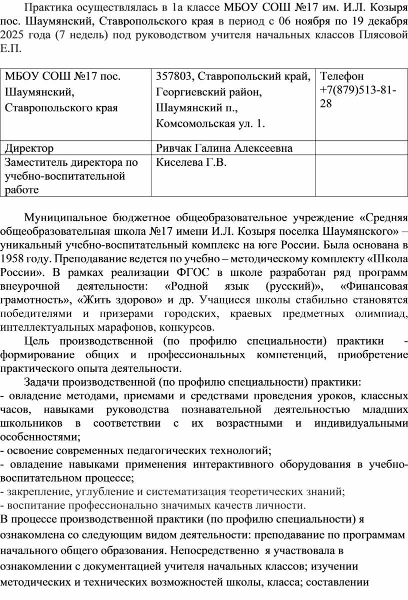 Практика осуществлялась в 1а классе МБОУ СОШ №17 им. И.Л. Козыря пос. Шаумянский, Ставропольского края в период с 06 ноября по 19 декабря 2025 года (7 недель) под руководством учителя начальных классов Плясовой Е.П.