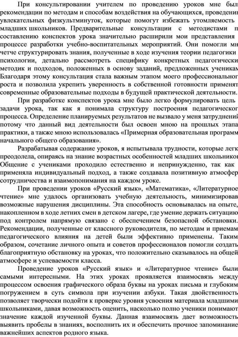 При консультировании учителем по проведению уроков мне были рекомендации по методам и способам воздействия на обучающихся, проведению увлекательных физкультминуток, которые помогут избежать утомляемость у младших школьников. Предварительные консультации с методистами по составлению конспектов урока значительно расширили мои представления о процессе разработки учебно-воспитательных мероприятий. Они помогли мне четче структурировать знания, полученные в ходе изучения теории педагогики и психологии, детально рассмотреть специфику конкретных педагогических методик и подходов, положенных в основу заданий, предложенных ученикам. Благодаря этому консультация стала важным этапом моего профессионального роста и позволила укрепить уверенность в собственной готовности применять современные образовательные подходы в будущей практической деятельности.
