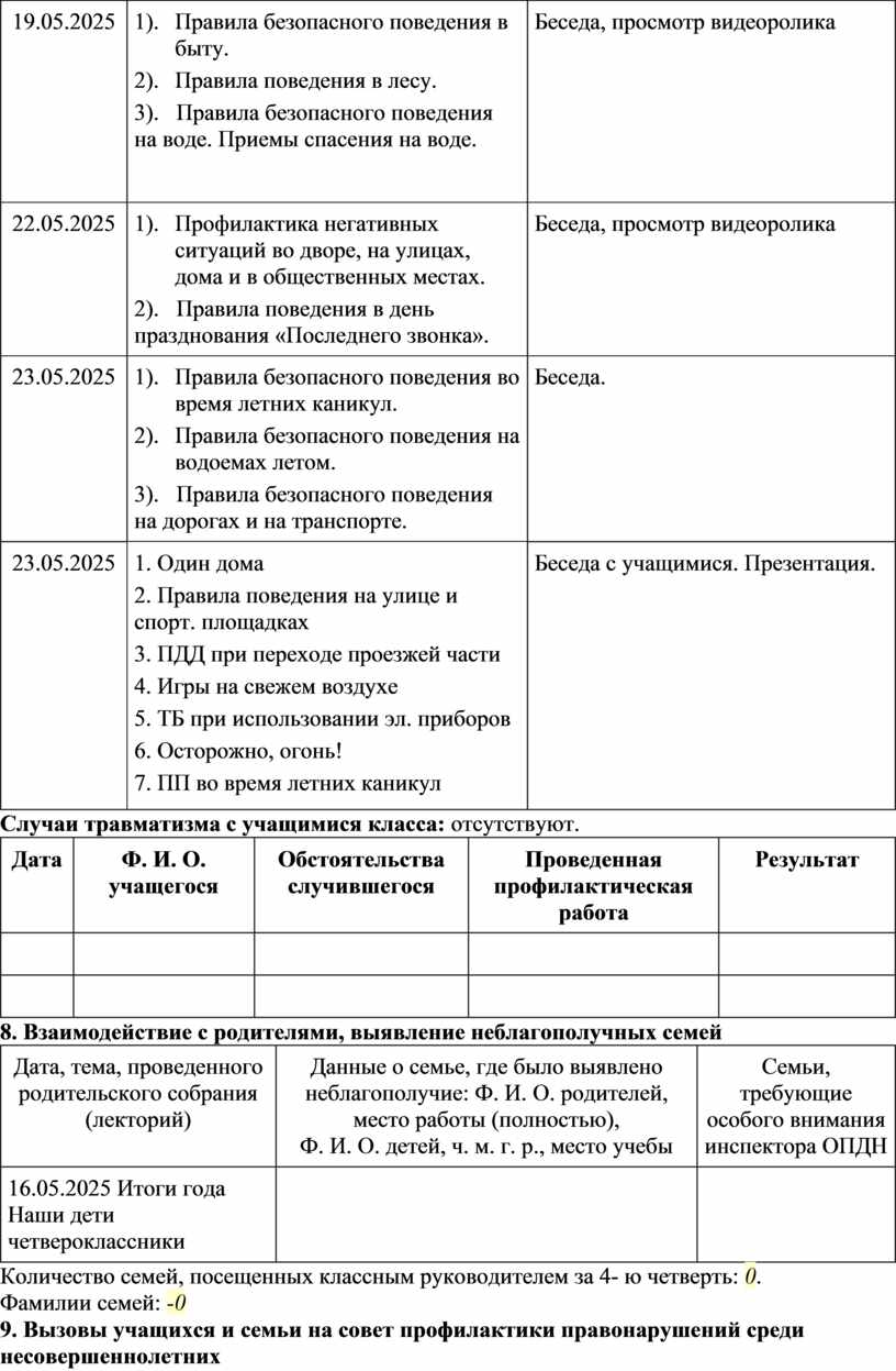 семей, посещенных классным руководителем за 4- ю четверть: 0.