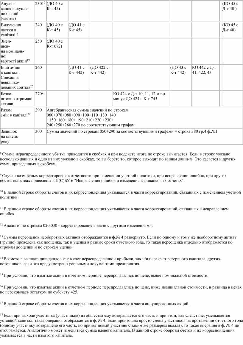 22 Для отображения изменений в капитале, не предусмотренных действующей формой № 4, в данном отчете можна использовать строки 120, 170, 200, тогда, соответственно, они включаются в итог.