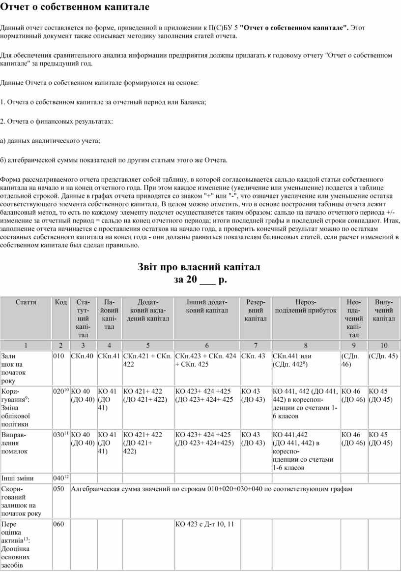Данный отчет составляется по форме, приведенной в приложении к П(С)БУ 5 "Отчет о собственном капитале". Этот нормативный документ также описывает методику заполнения статей отчета.