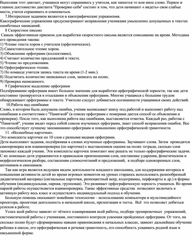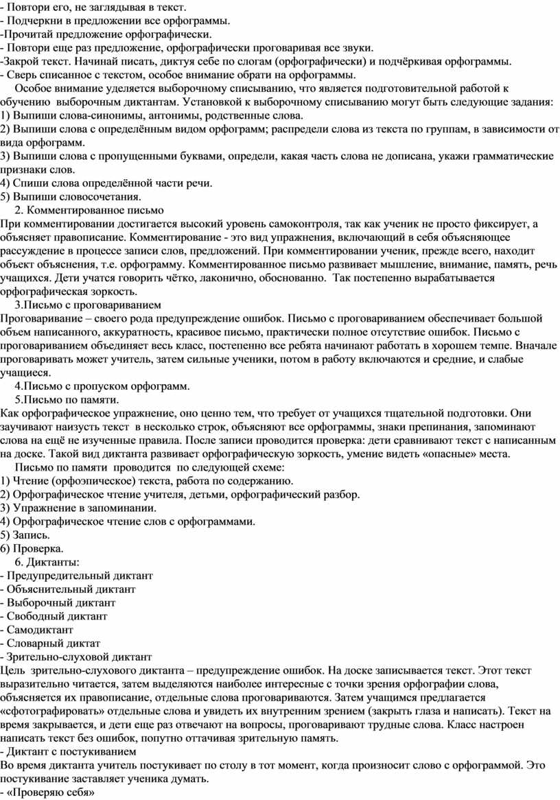 Как орфографическое упражнение, оно ценно тем, что требует от учащихся тщательной подготовки. Они заучивают наизусть текст в несколько строк, объясняют все орфограммы, знаки препинания, запоминают слова на ещё не изученные правила. После записи проводится проверка: дети сравнивают текст с написанным на доске. Такой вид диктанта развивает орфографическую зоркость, умение видеть «опасные» места.