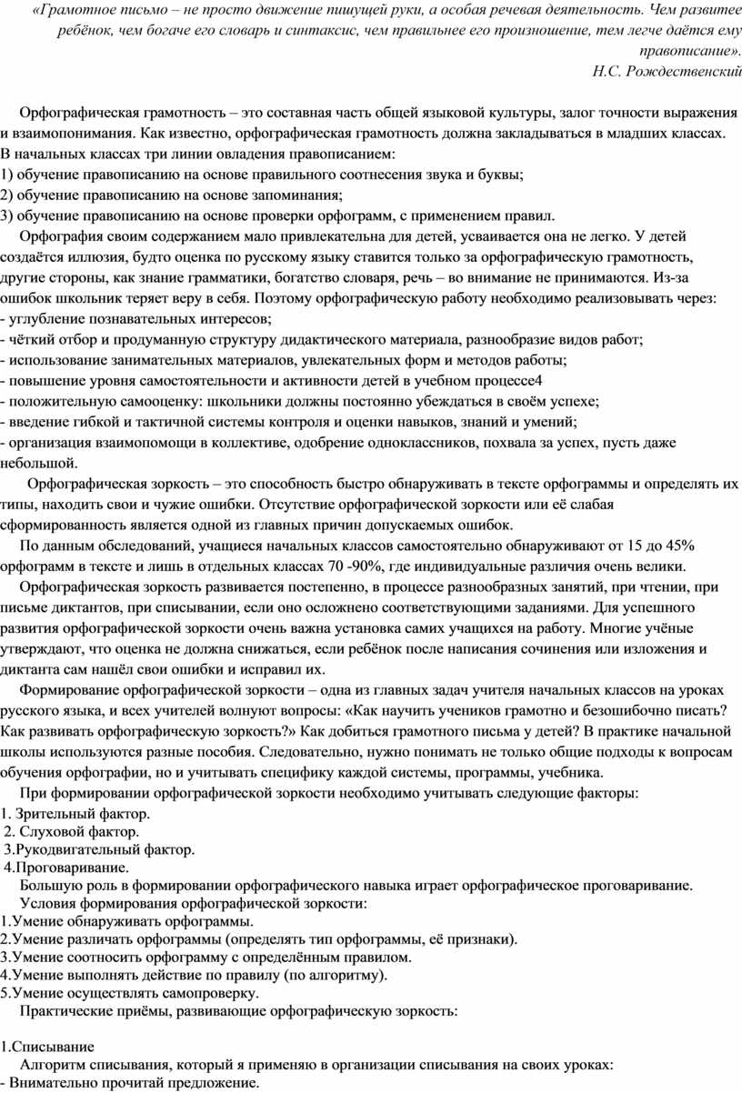 Формирование орфографической зоркости – одна из главных задач учителя начальных классов на уроках русского языка, и всех учителей волнуют вопросы: «Как научить учеников грамотно и безошибочно писать? Как развивать орфографическую зоркость?» Как добиться грамотного письма у детей? В практике начальной школы используются разные пособия. Следовательно, нужно понимать не только общие подходы к вопросам обучения орфографии, но и учитывать специфику каждой системы, программы, учебника.