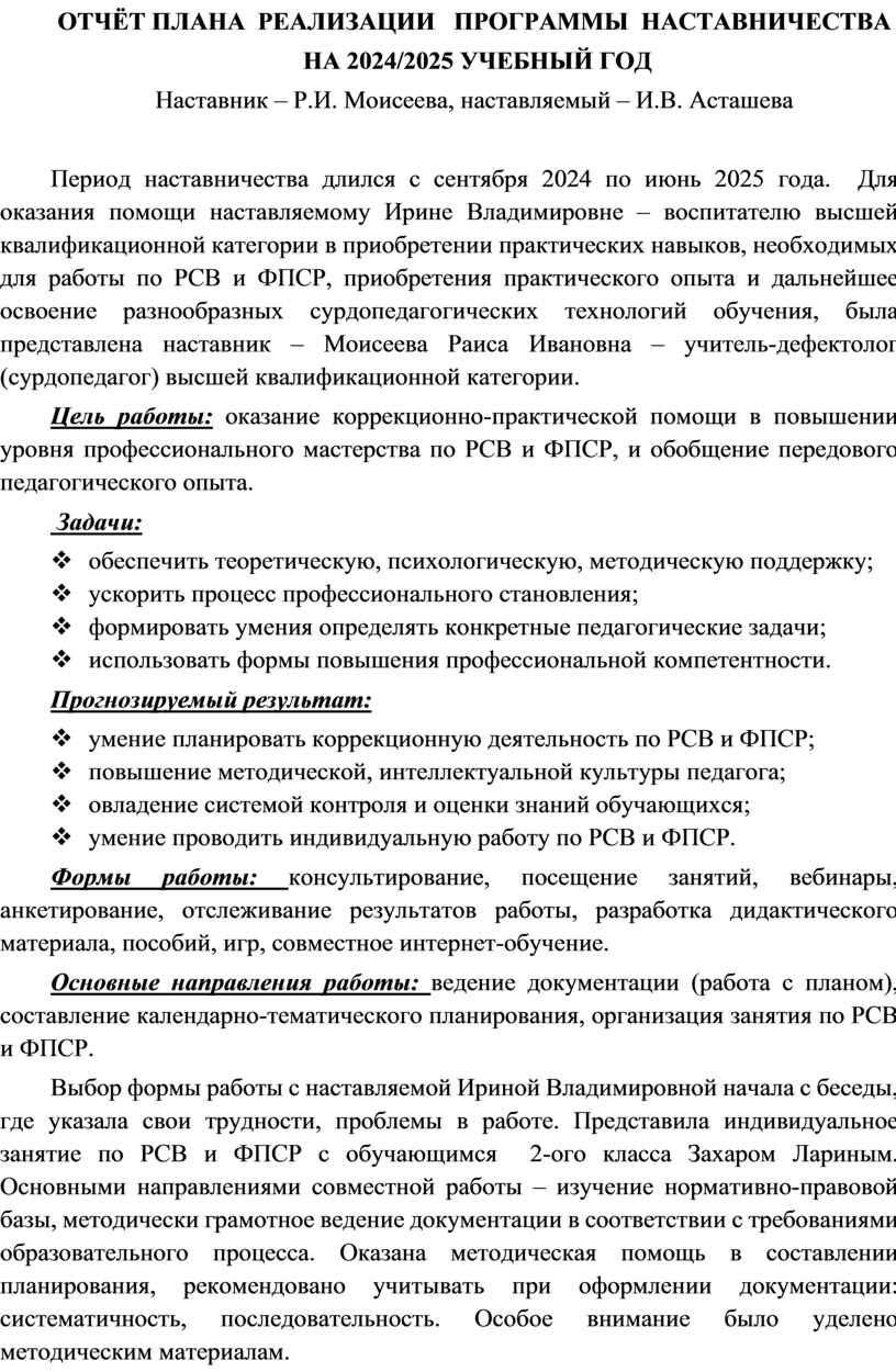 Период наставничества длился с сентября 2024 по июнь 2025 года. Для оказания помощи наставляемому Ирине Владимировне – воспитателю высшей квалификационной категории в приобретении практических навыков, необходимых для работы по РСВ и ФПСР, приобретения практического опыта и дальнейшее освоение разнообразных сурдопедагогических технологий обучения, была представлена наставник – Моисеева Раиса Ивановна – учитель-дефектолог (сурдопедагог) высшей квалификационной категории.