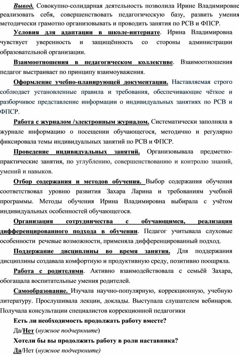 Выбор формы работы с наставляемой Ириной Владимировной начала с беседы, где указала свои трудности, проблемы в работе. Представила индивидуальное занятие по РСВ и ФПСР с обучающимся 2-ого класса Захаром Лариным. Основными направлениями совместной работы – изучение нормативно-правовой базы, методически грамотное ведение документации в соответствии с требованиями образовательного процесса. Оказана методическая помощь в составлении планирования, рекомендовано учитывать при оформлении документации: систематичность, последовательность. Особое внимание было уделено методическим материалам.