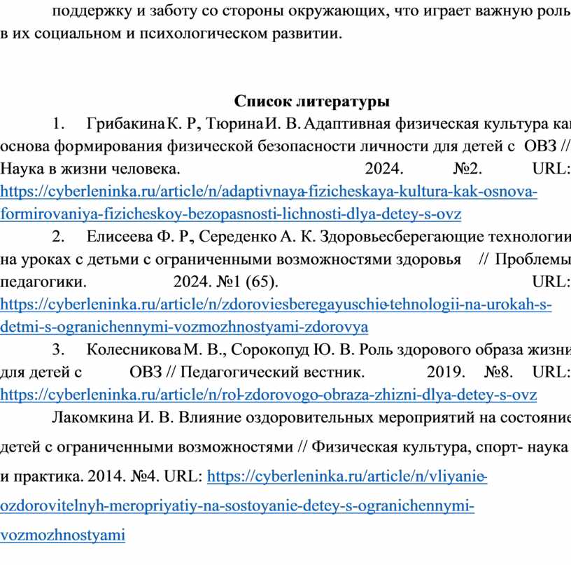 3. Колесникова М. В., Сорокопуд Ю. В. Роль здорового образа жизни для детей с ОВЗ // Педагогический вестник. 2019. №8. URL: https://cyberleninka.ru/article/n/rol-zdorovogo-obraza-zhizni-dlya-detey-s-ovz