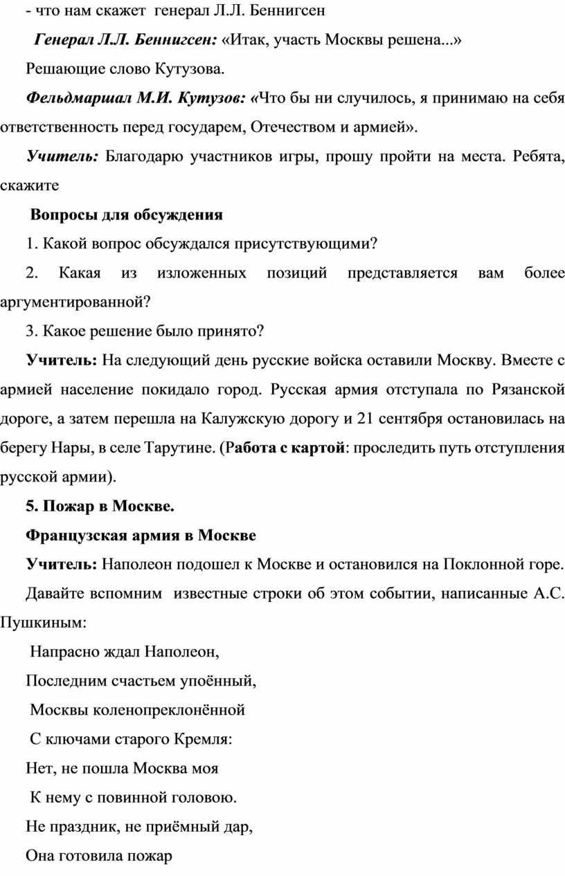 • представлять, какие последствия для Москвы и для России имело вторжение Наполеона;