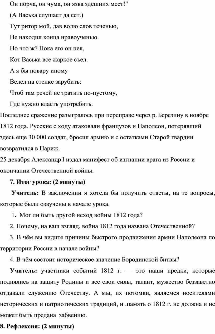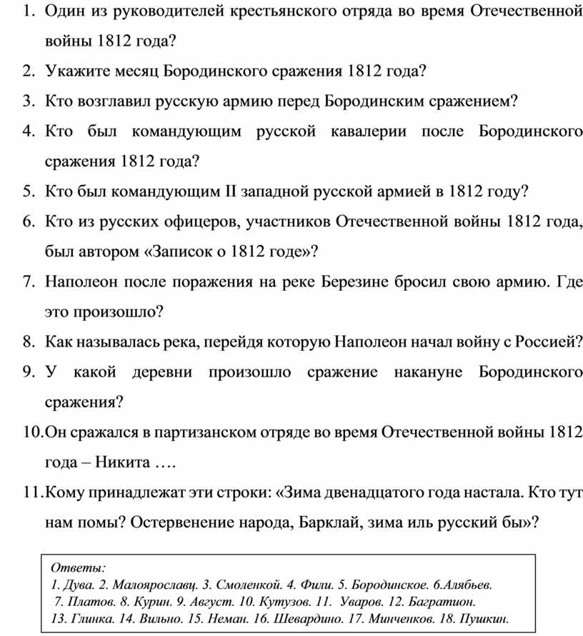 Учитель: Сегодня по прошествии 2 веков со дня тех героических времён мы попробуем ответить на вопросы которые волновали и современников и интересны нам-потомкам героев тех славных лет.