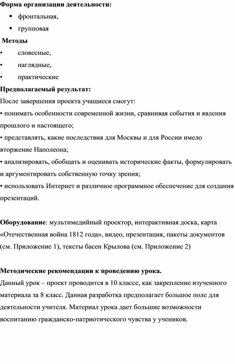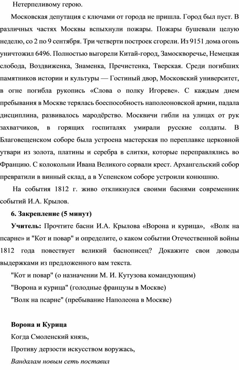 Оборудование: мультимедийный проектор, интерактивная доска, карта «Отечественная война 1812 года», видео, презентация, пакеты документов (см. Приложение 1), тексты басен Крылова (см. Приложение 2)