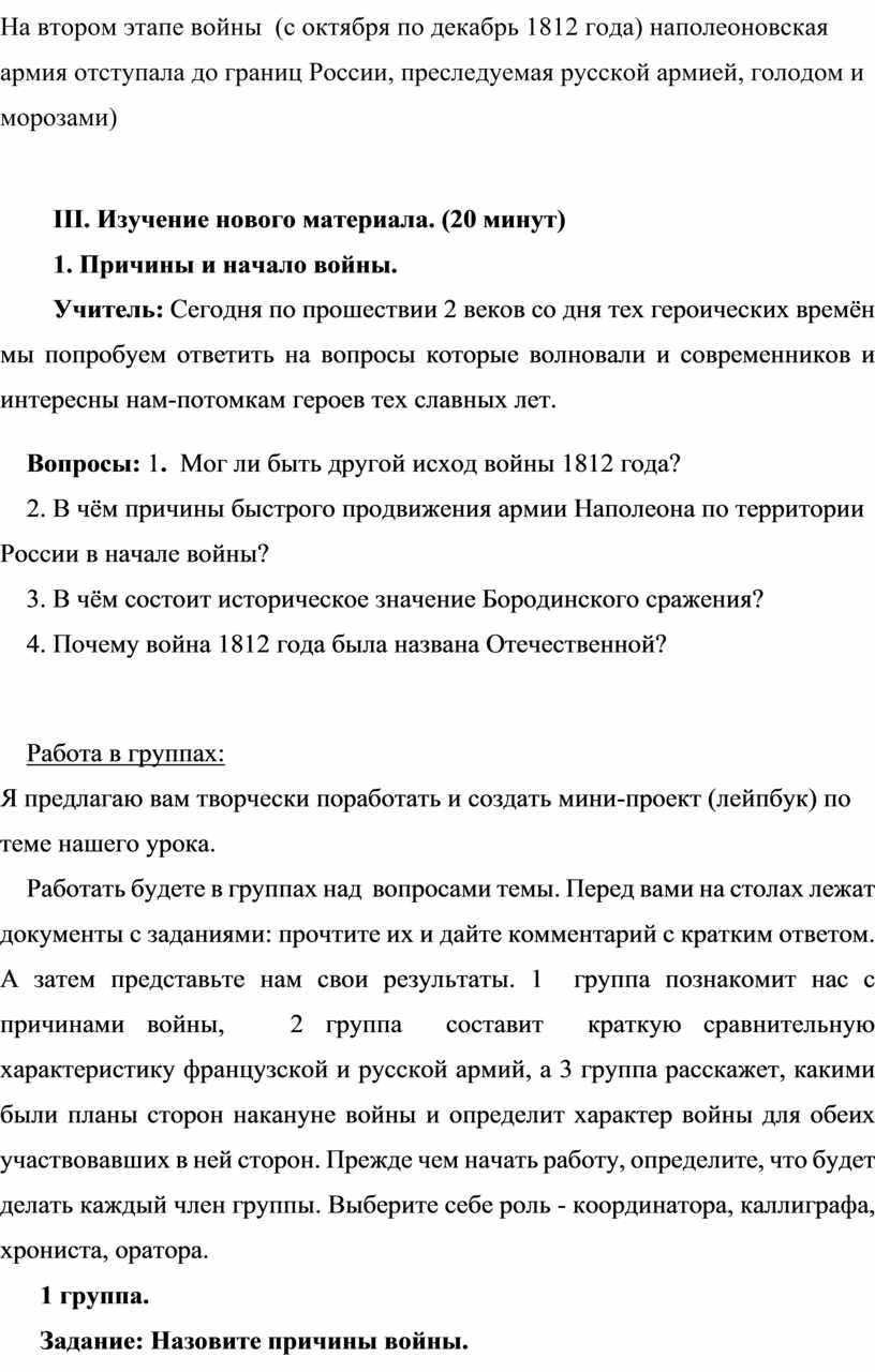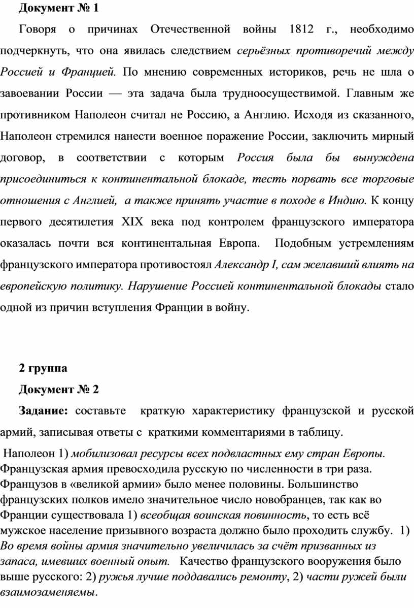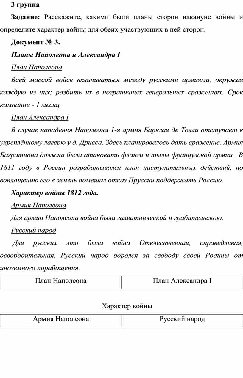 Работать будете в группах над вопросами темы. Перед вами на столах лежат документы с заданиями: прочтите их и дайте комментарий с кратким ответом. А затем представьте нам свои результаты. 1 группа познакомит нас с причинами войны, 2 группа составит краткую сравнительную характеристику французской и русской армий, а 3 группа расскажет, какими были планы сторон накануне войны и определит характер войны для обеих участвовавших в ней сторон. Прежде чем начать работу, определите, что будет делать каждый член группы. Выберите себе роль - координатора, каллиграфа, хрониста, оратора.