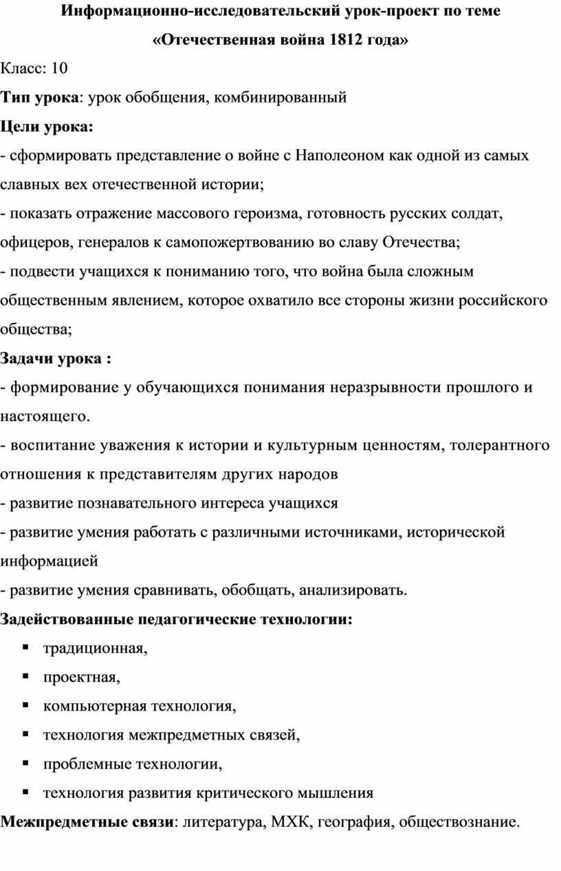 Информационно-исследовательский урок-проект по теме «Отечественная война 1812 года»