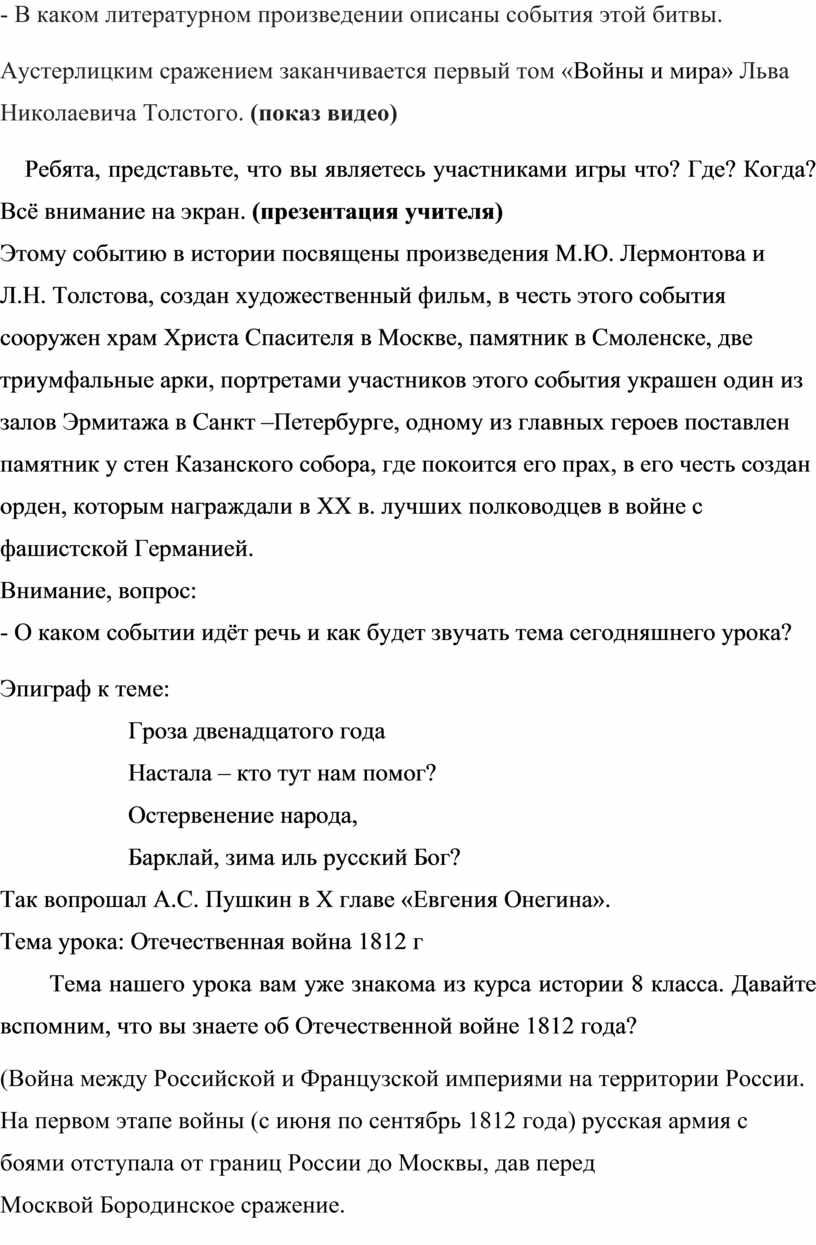 Аустерлицким сражением заканчивается первый том «Войны и мира» Льва Николаевича Толстого. (показ видео)