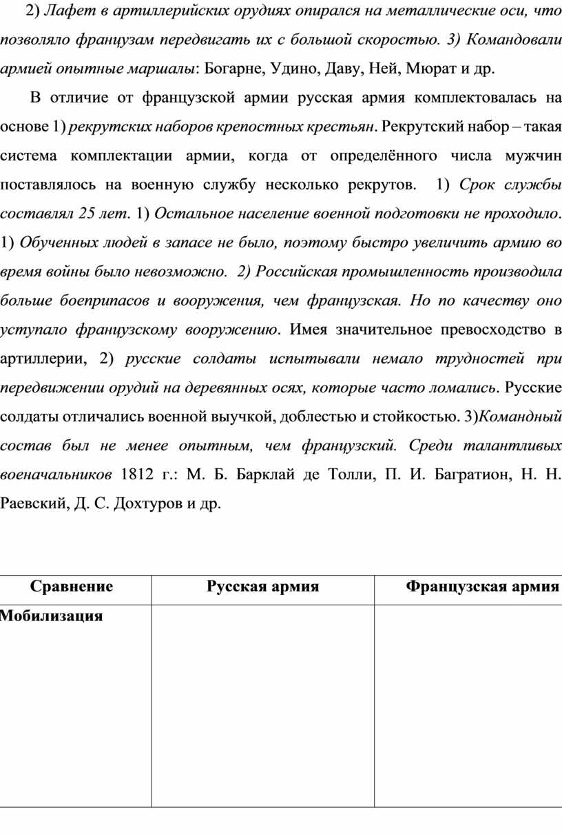В отличие от французской армии русская армия комплектовалась на основе 1) рекрутских наборов крепостных крестьян. Рекрутский набор – такая система комплектации армии, когда от определённого числа мужчин поставлялось на военную службу несколько рекрутов. 1) Срок службы составлял 25 лет. 1) Остальное население военной подготовки не проходило. 1) Обученных людей в запасе не было, поэтому быстро увеличить армию во время войны было невозможно. 2) Российская промышленность производила больше боеприпасов и вооружения, чем французская. Но по качеству оно уступало французскому вооружению. Имея значительное превосходство в артиллерии, 2) русские солдаты испытывали немало трудностей при передвижении орудий на деревянных осях, которые часто ломались. Русские солдаты отличались военной выучкой, доблестью и стойкостью. 3)Командный состав был не менее опытным, чем французский. Среди талантливых военачальников 1812 г.: М. Б. Барклай де Толли, П. И. Багратион, Н. Н. Раевский, Д. С. Дохтуров и др.