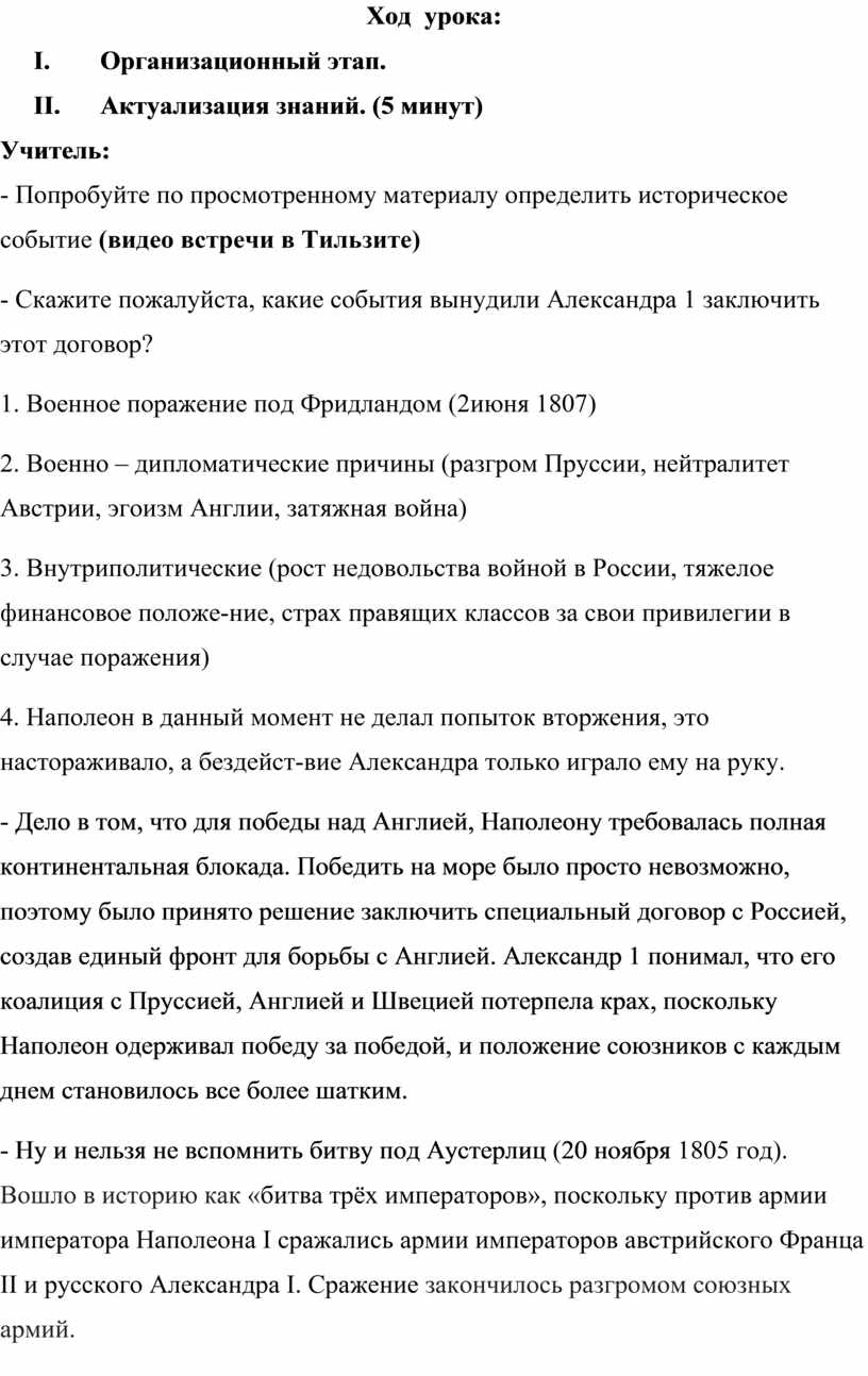 - Скажите пожалуйста, какие события вынудили Александра 1 заключить этот договор?