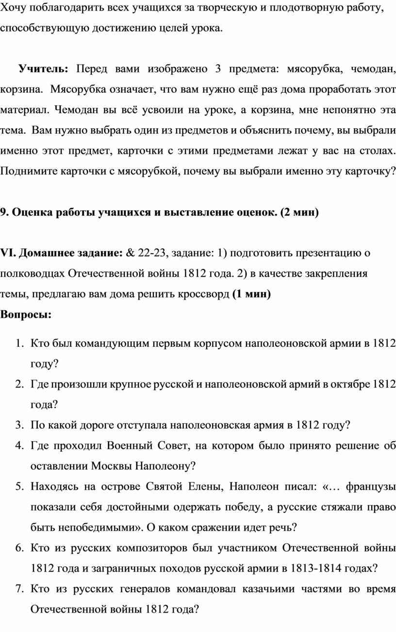 VI. Домашнее задание: & 22-23, задание: 1) подготовить презентацию о полководцах Отечественной войны 1812 года. 2) в качестве закрепления темы, предлагаю вам дома решить кроссворд (1 мин)
