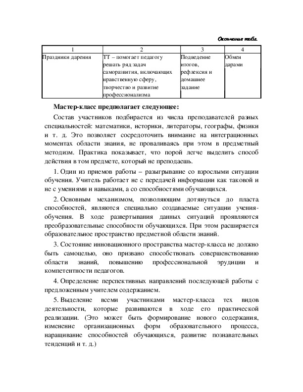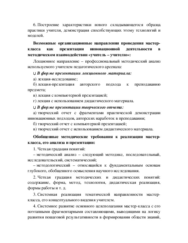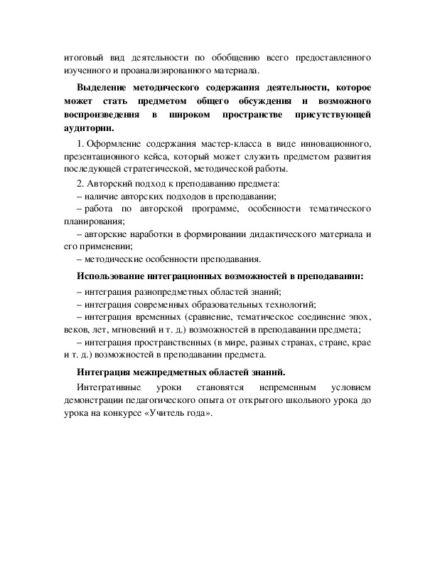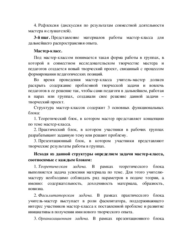 Предлагаемый методический материал создан с целью оказания помощи педагогу в создании и проведении собственных мастер-классов как важнейшей формы самооценки собственного педагогического мастерства. Мастер-классы сегодня – одна из важнейших характеристик нового педагогического профессионализма, саморазвития, самосовершенствования в своей профессии, это способность к обобщению и распространению собственного педагогического опыта.