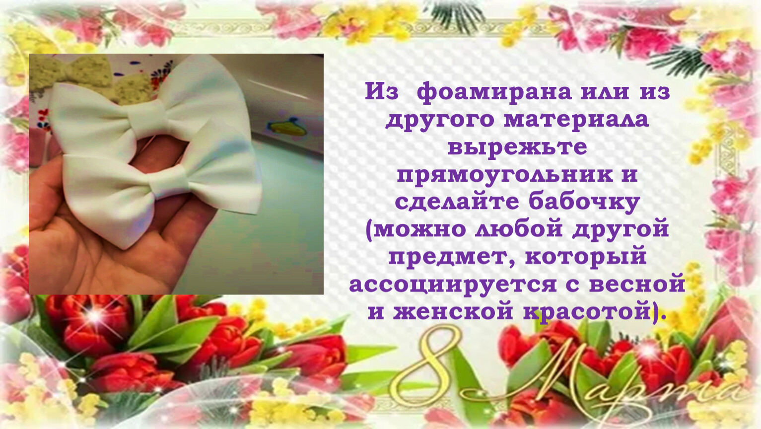Из фоамирана или из другого материала вырежьте прямоугольник и сделайте бабочку (можно любой другой предмет, который ассоциируется с весной и женской красотой).