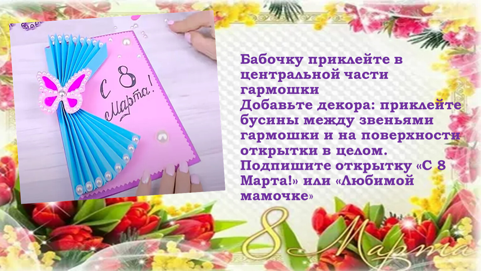 Бабочку приклейте в центральной части гармошкиДобавьте декора: приклейте бусины между звеньями гармошки и на поверхности открытки в целом. Подпишите открытку «С 8 Марта!» или «Любимой мамочке»