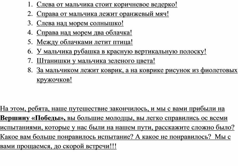 На этом, ребята, наше путешествие закончилось, и мы с вами прибыли на Вершину «Победы», вы большие молодцы, вы легко справились ос всеми испытаниями, которые у нас были на нашем пути, расскажите сложно было? Какое вам больше понравилось испытание? А какое не понравилось? Мы с вами прощаемся, до скорой встречи!!!