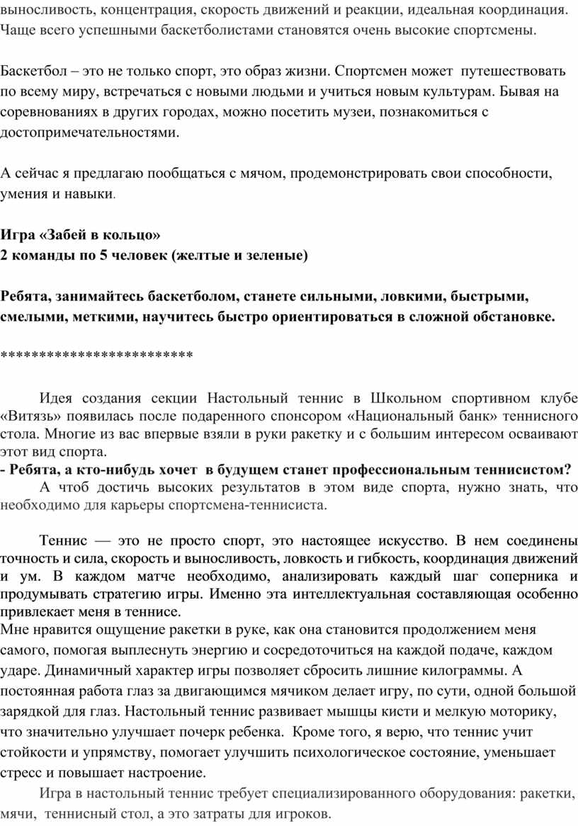 Идея создания секции Настольный теннис в Школьном спортивном клубе «Витязь» появилась после подаренного спонсором «Национальный банк» теннисного стола. Многие из вас впервые взяли в руки ракетку и с большим интересом осваивают этот вид спорта.