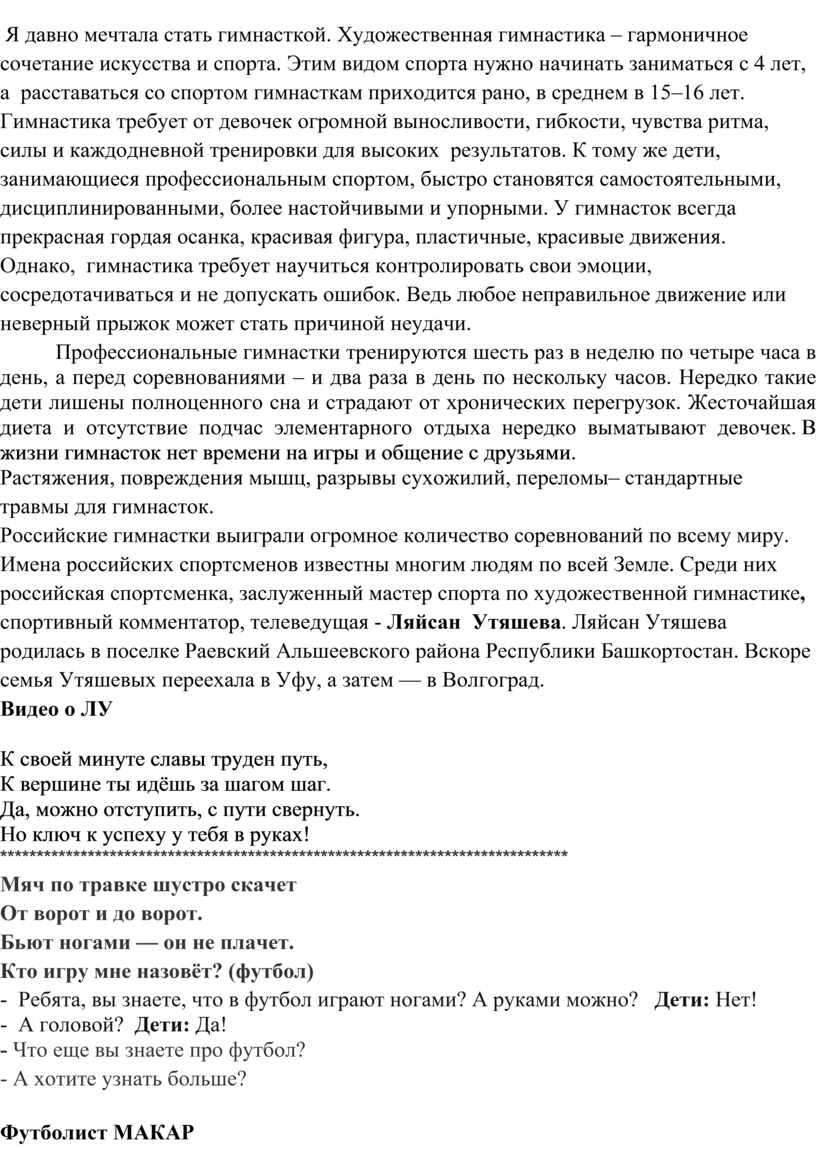 Я давно мечтала стать гимнасткой. Художественная гимнастика – гармоничное сочетание искусства и спорта. Этим видом спорта нужно начинать заниматься с 4 лет, а расставаться со спортом гимнасткам приходится рано, в среднем в 15–16 лет.