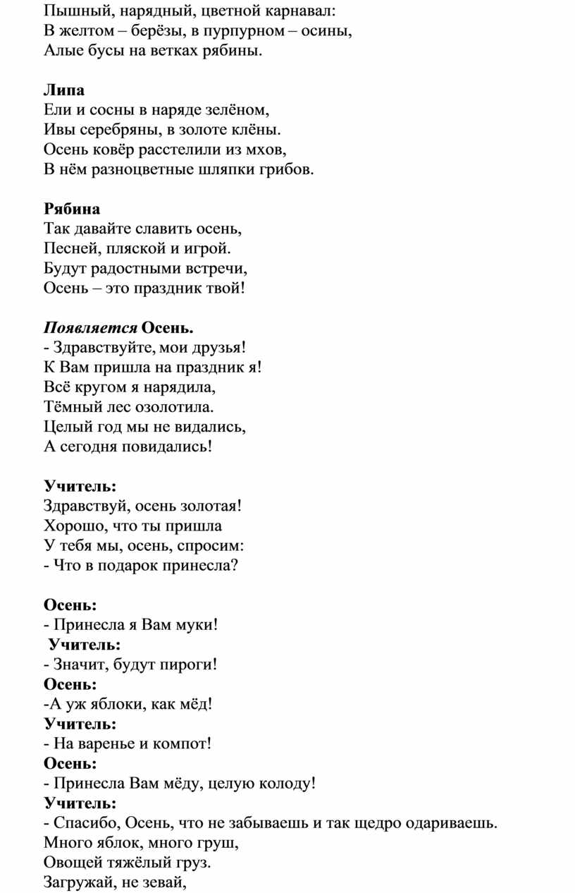 Учитель: Вот сколько даров нам приготовлено. А листьев сколько! И все яркие! Желтые, оранжевые, красные и очень красивые! А какое время года помогает насладиться нам яркими красками и чудесным урожаем? Правильно, осень! Наступил последний месяц осени, а это значит, что осень у нас сейчас полноправная хозяйка и настало время поблагодарить её за доброту!