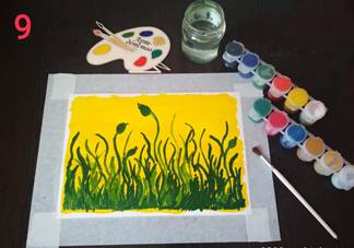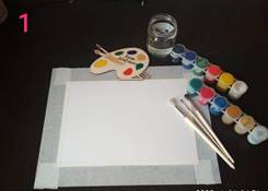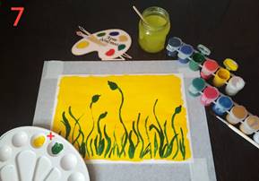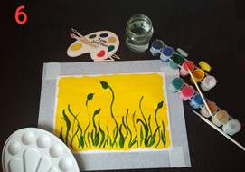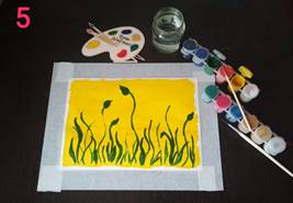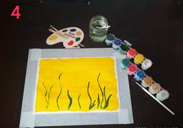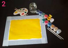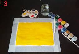 С помощью монтажного скотча,закрепляем лист бумаги к поверхности стола, отступив от краев листа по 1,5 см.- Желтой краской заполняем фон.