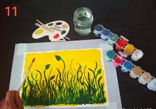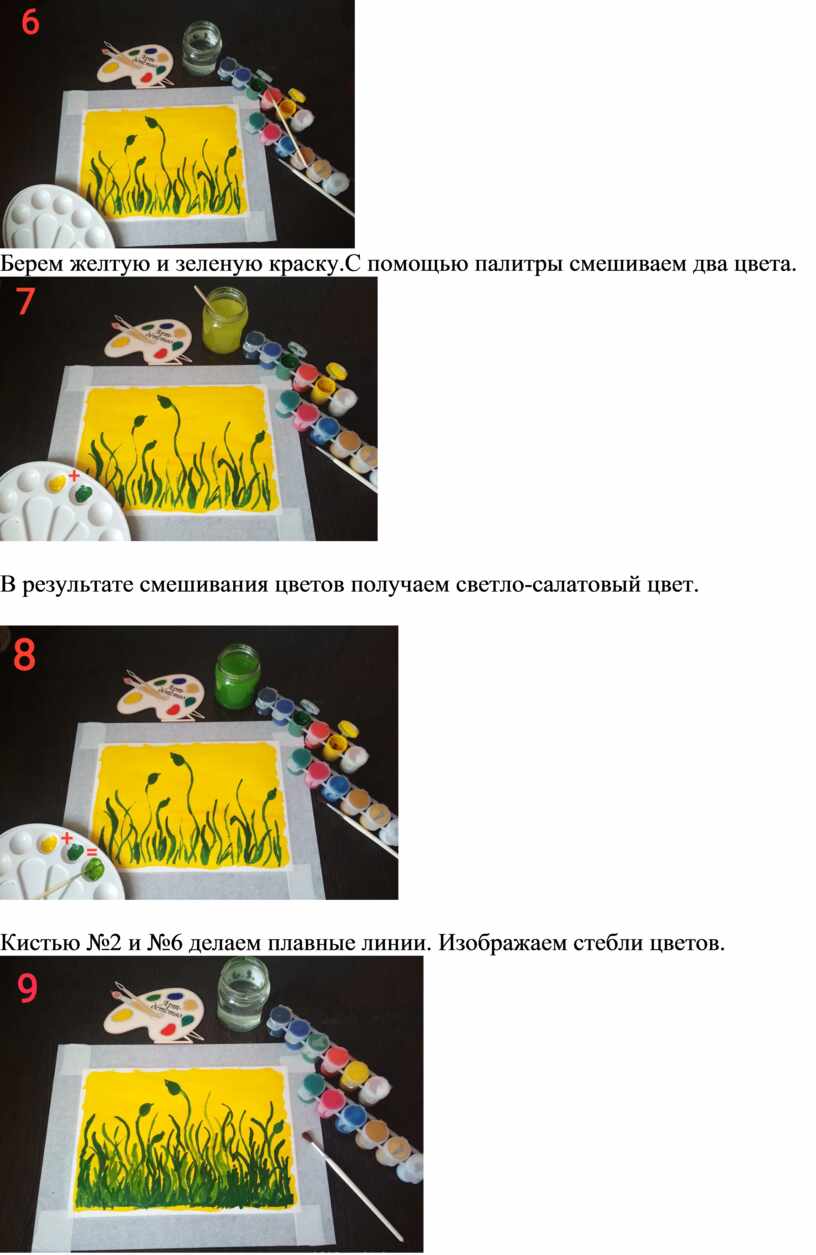 Берем желтую и зеленую краску.С помощью палитры смешиваем два цвета.