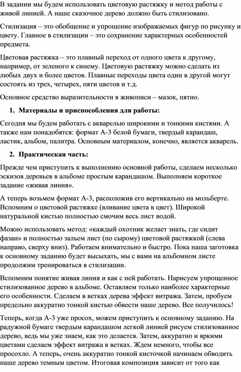 Тема сегодняшнего занятия: «Сказочные деревья». Цель занятия: научиться работать линией, познакомиться с понятием «стилизация». Основная задача: вспомнить технику акварели, закрепить умение работать широкой кистью. Вспомнить основные и вторичные цвета. Выполнить задание на растяжку цвета. Затем, пользуясь навыками, выполнить основное задание.