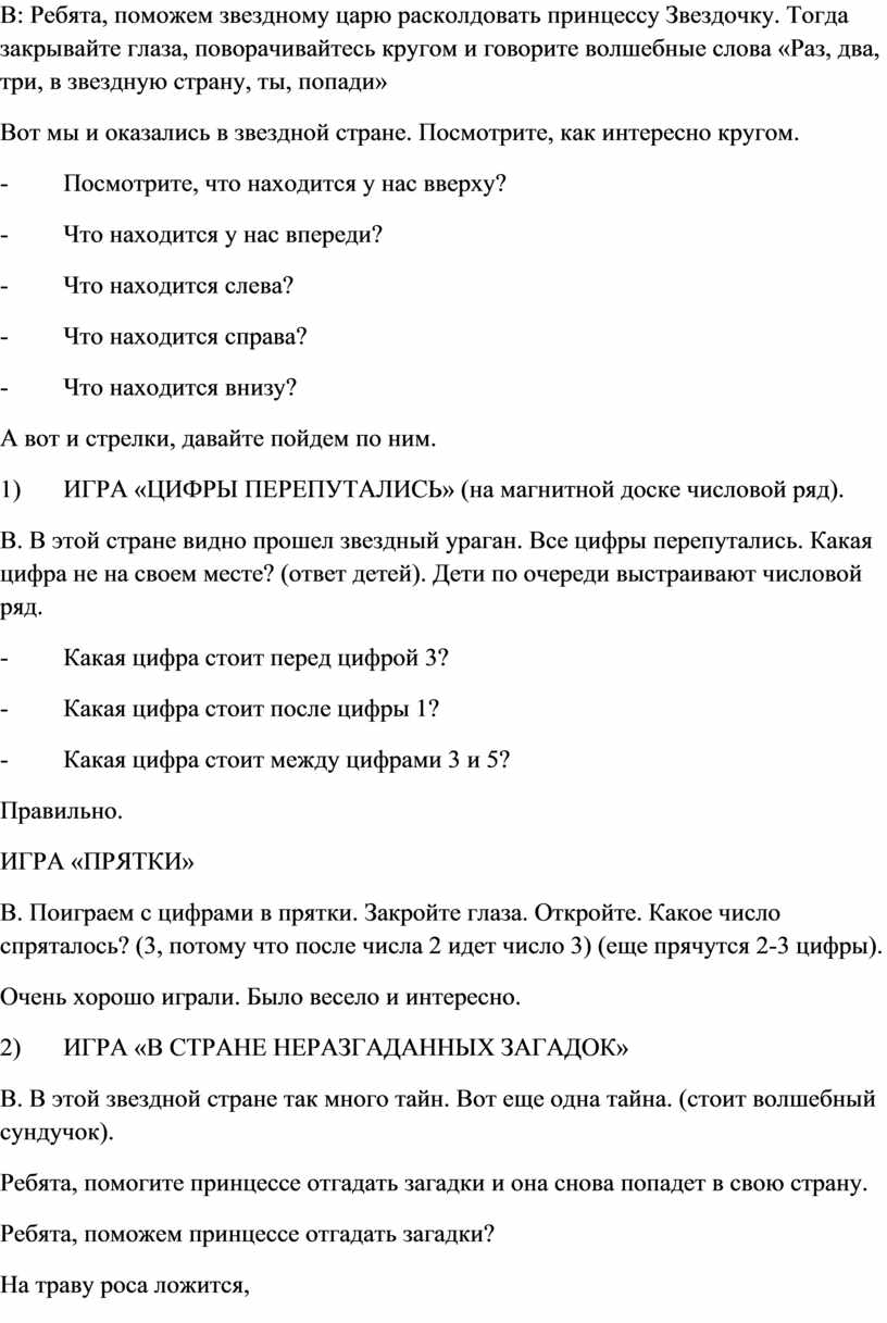 В: Ребята, поможем звездному царю расколдовать принцессу Звездочку. Тогда закрывайте глаза, поворачивайтесь кругом и говорите волшебные слова «Раз, два, три, в звездную страну, ты, попади»