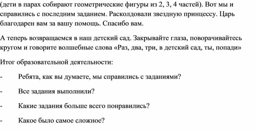 (дети в парах собирают геометрические фигуры из 2, 3, 4 частей). Вот мы и справились с последним заданием. Расколдовали звездную принцессу. Царь благодарен вам за вашу помощь. Спасибо вам.