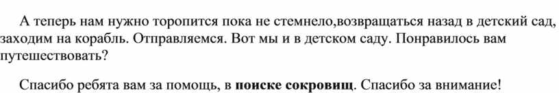 А теперь нам нужно торопится пока не стемнело,возвращаться назад в детский сад, заходим на корабль. Отправляемся. Вот мы и в детском саду. Понравилось вам путешествовать?