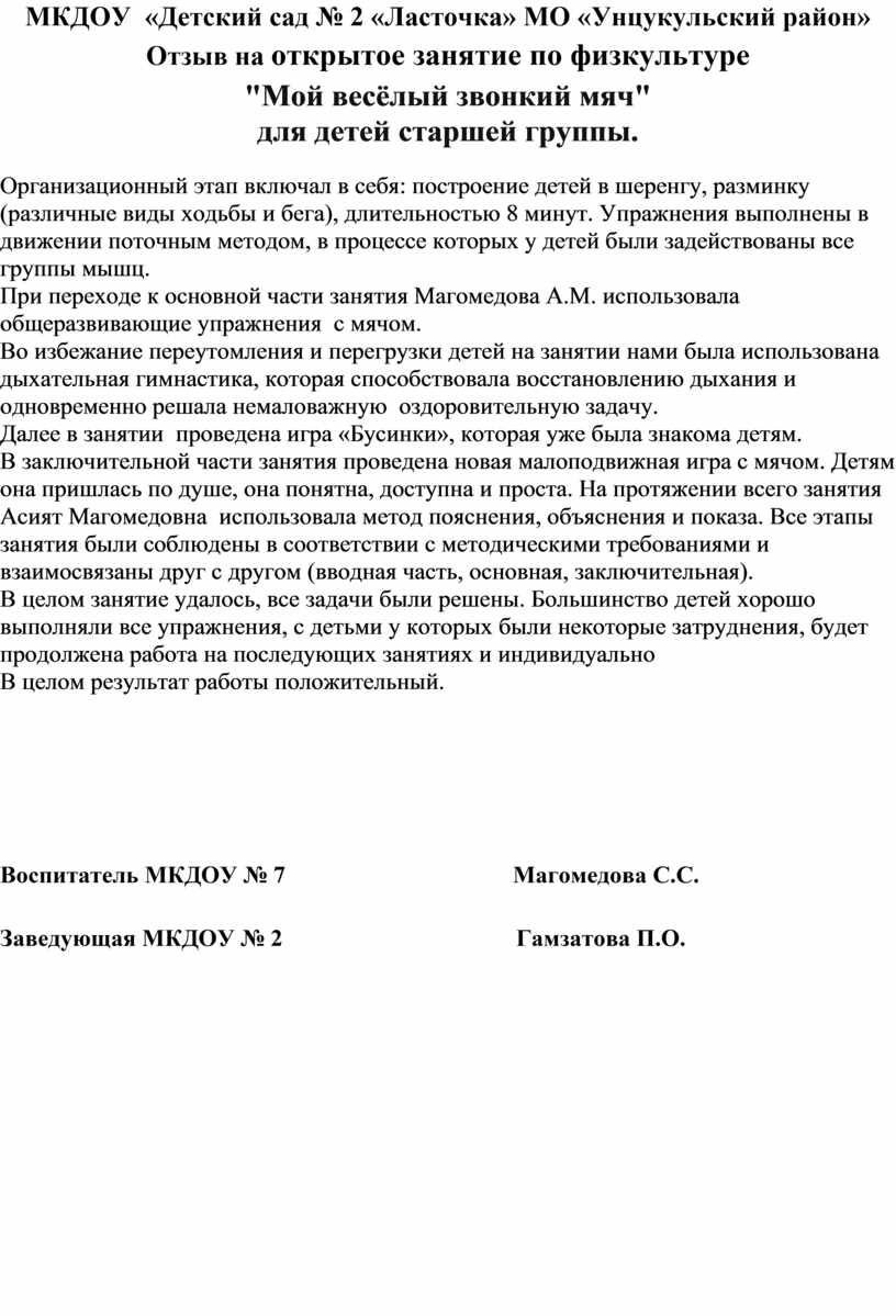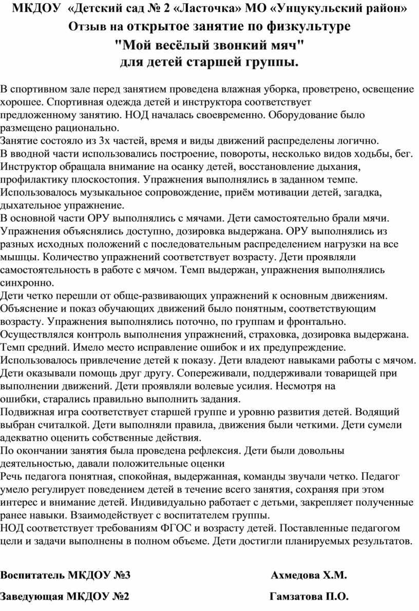 В заключительной части занятия проведена новая малоподвижная игра с мячом. Детям она пришлась по душе, она понятна, доступна и проста. На протяжении всего занятия Асият Магомедовна использовала метод пояснения, объяснения и показа. Все этапы занятия были соблюдены в соответствии с методическими требованиями и взаимосвязаны друг с другом (вводная часть, основная, заключительная).