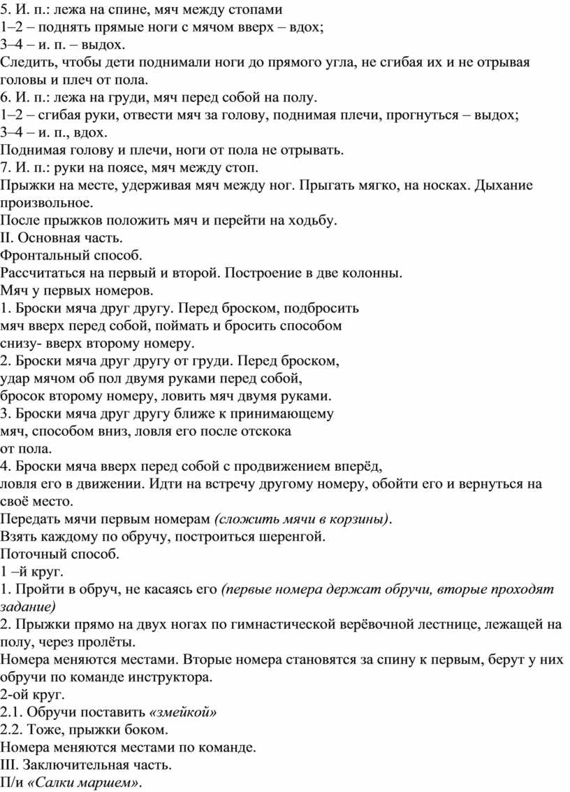 В основной части ОРУ выполнялись с мячами. Дети самостоятельно брали мячи. Упражнения объяснялись доступно, дозировка выдержана. ОРУ выполнялись из разных исходных положений с последовательным распределением нагрузки на все мышцы. Количество упражнений соответствует возрасту. Дети проявляли самостоятельность в работе с мячом. Темп выдержан, упражнения выполнялись синхронно.