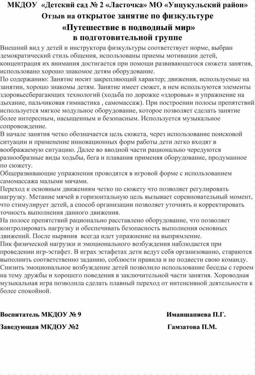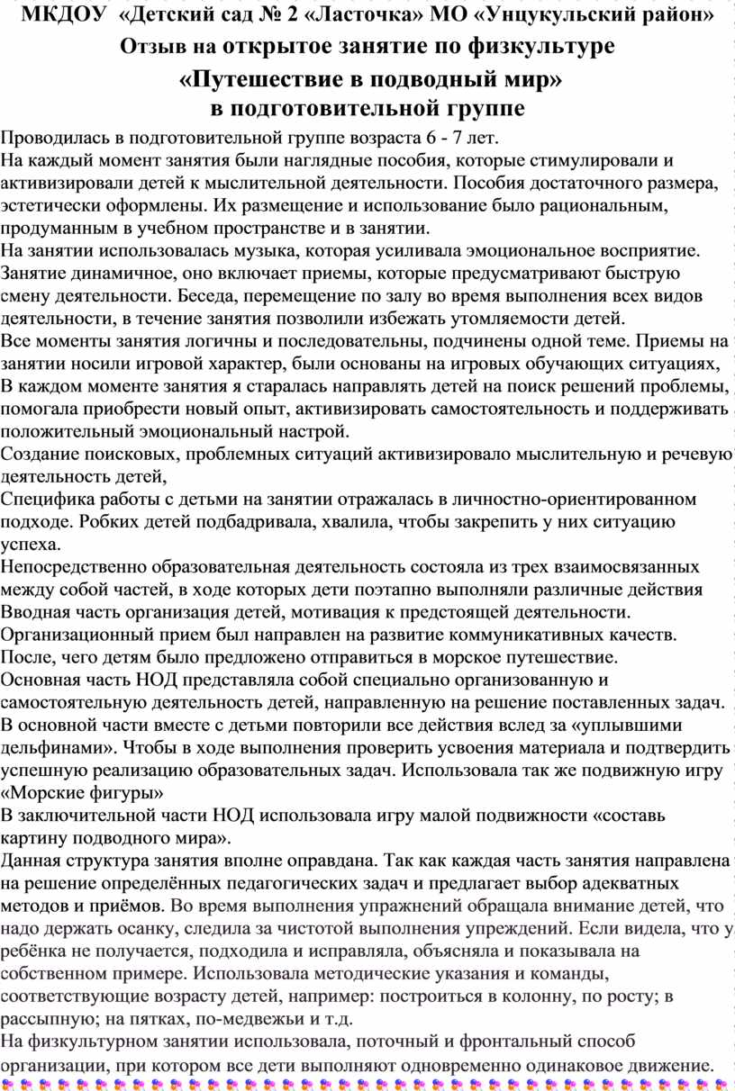 Внешний вид у детей и инструктора физкультуры соответствует норме, выбран демократический стиль общения, использованы приемы мотивации детей, концентрация их внимания достигается при помощи развивающегося сюжета занятия, использовано хорошо знакомое детям оборудование.