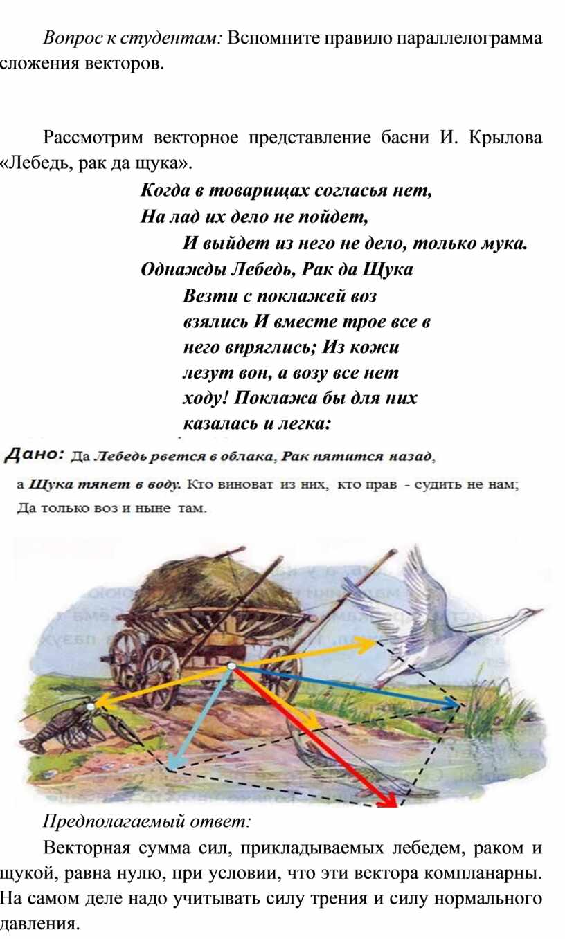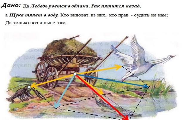 Векторная сумма сил, прикладываемых лебедем, раком и щукой, равна нулю, при условии, что эти вектора компланарны. На самом деле надо учитывать силу трения и силу нормального давления.