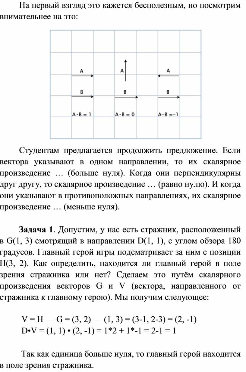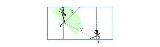 Задача 1. Допустим, у нас есть стражник, расположенный в G(1, 3) смотрящий в направлении D(1, 1), с углом обзора 180 градусов. Главный герой игры подсматривает за ним с позиции H(3, 2). Как определить, находится ли главный герой в поле зрения стражника или нет? Сделаем это путём скалярного произведения векторов G и V (вектора, направленного от стражника к главному герою). Мы получим следующее: